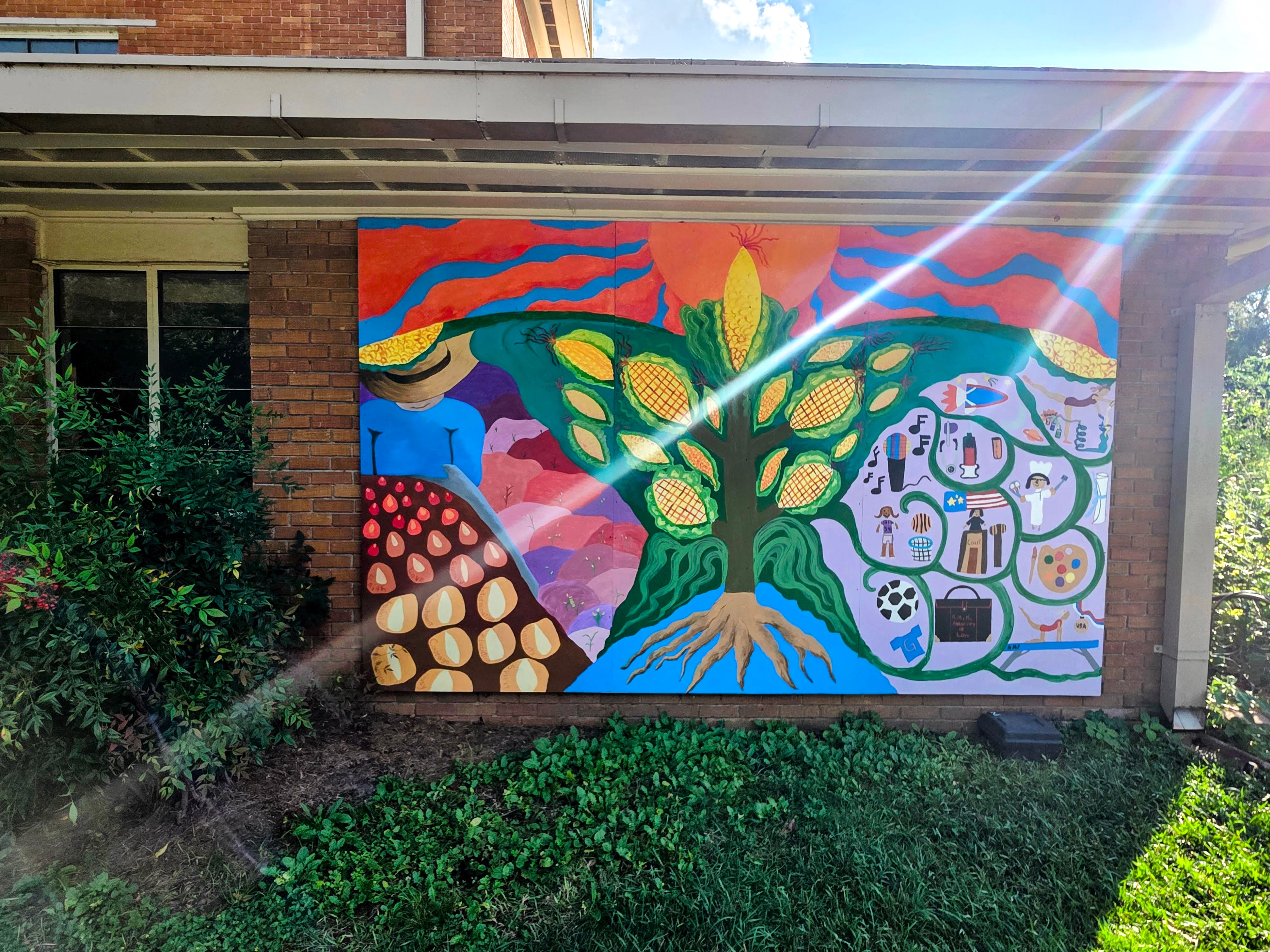 I climbed the hill toward the Woodland Park community center and paused before a beautiful mural. A Tree of Life rises up from the earth with roots that weave deep into the soil. Corn blossoms from its branches, and light radiates through its crown.